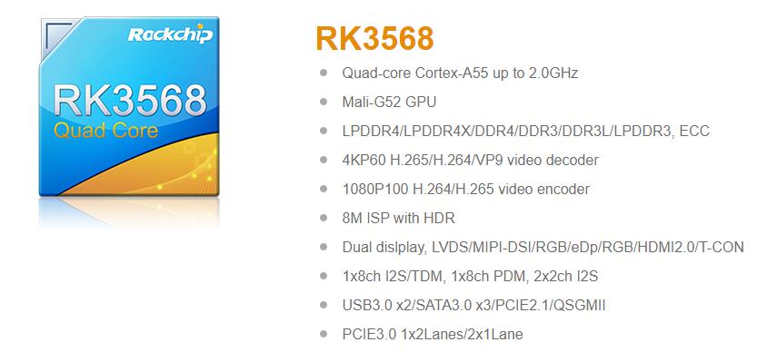 RK3568支持豐富的接口擴展,擁有更靈活的IOMUX,引腳多功能組合應用,可根據(jù)產(chǎn)品需求選擇,滿足更多樣的功能組合需求。支持PCIE2.1 1x1Lane,滿足4G/5G、wifi6、多網(wǎng)口、NPU等擴展需求。RK3568支持3x SATA3.0,解決傳統(tǒng)AP處理器USB擴展SATA各種不穩(wěn)定問題,最多支持4路USB口,1xUSB3.0/USB2.0 HOST + 1xUSB3.0/USB2.0 OTG + 1xUSB2.0 HOST + 1xUSB2.0 HOST。支持雙千兆以太網(wǎng)口,并且支持QSGMII以減少IO口占用,滿足工控及物聯(lián)網(wǎng)網(wǎng)關等的多網(wǎng)口需求。