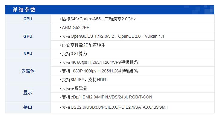 瑞芯微RK3568芯片自帶NPU加速模塊,算力0.8T,用來運行人臉識別、車牌識別等深度學習算法具有極高的運行速度,相比rv1109/rv1126來說一大優(yōu)勢是支持安卓系統(tǒng),用戶使用起來更加方便。  RK3568定位中高端,采用22nm制程工藝,集成4核arm架構A55處理器和Mali G52 2EE圖形處理器,支持4K解碼和1080P編碼。